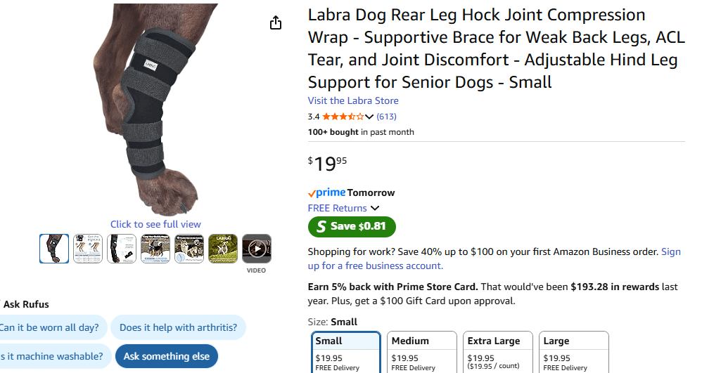 With Rocky being prone to ankle sprains, restricting the limb is often time sensitive and essential. This Compression Wrap by the Labra Store on Amazon is super handy to have on those days when Rocky attempts a stunt as if he is still only a puppy, and is available not just for hind-leg injuries, but front leg and shoulder injuries as well.